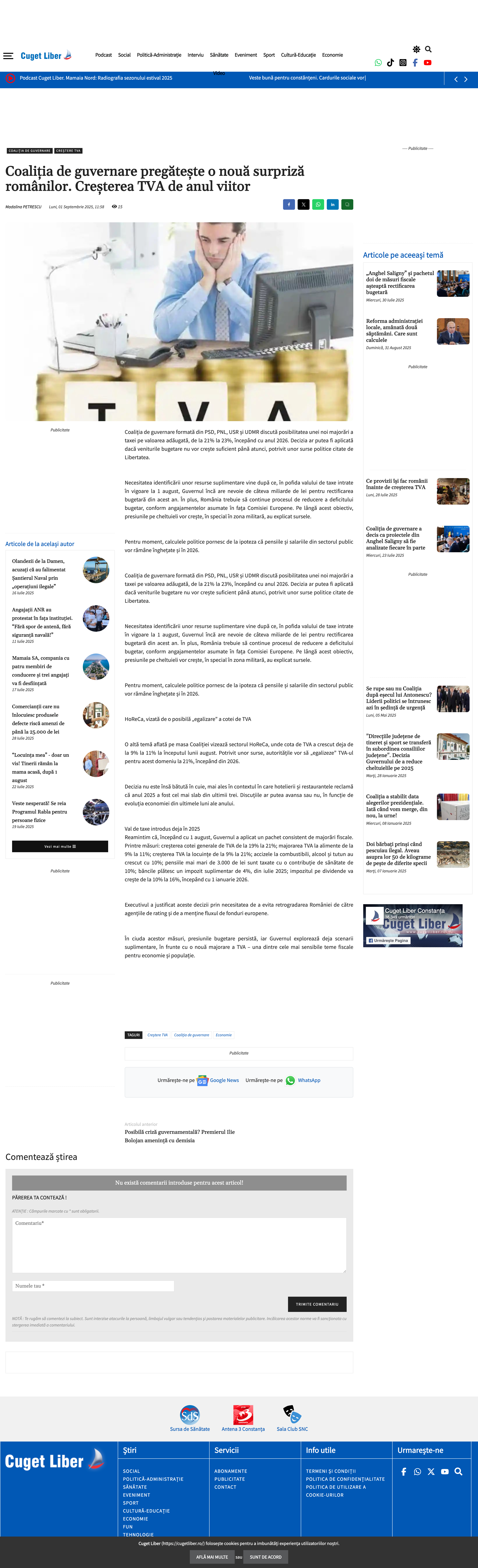 Coaliția de guvernare formată din PSD, PNL, USR și UDMR discută posibilitatea unei noi majorări a taxei pe valoarea adăugată, de la 21% la 23%, începând cu anul 2026. Decizia ar putea fi aplicată dacă veniturile bugetare nu vor crește suficient până atunci, potrivit unor surse politice citate de Libertatea.